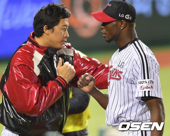 17일 오후 잠실구장에서 열린 '2013 한국야쿠르트 세븐 프로야구' LG 트윈스와 두산 베어스의 플레이오프 2차전, 6회초 두산 공격을 삼자범퇴로 막아낸 뒤 더그아웃으로 들어오는 LG 선발 리즈와 이병규가 인사를 나누고 있다.