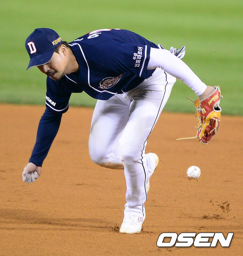 17일 오후 잠실구장에서 열린 '2013 한국야쿠르트 세븐 프로야구' LG 트윈스와 두산 베어스의 플레이오프 2차전, 6회말 무사에서 두산 오재원이 LG 박용택의 2루 땅볼 타구를 맨손캐치하려다 뒤로 빠뜨리고 있다.
