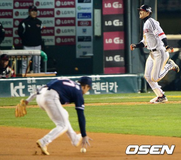 17일 오후 잠실구장에서 열린 '2013 한국야쿠르트 세븐 프로야구' LG 트윈스와 두산 베어스의 플레이오프 2차전, 6회말 무사에서 LG 박용택이 2루수앞 내야안타를 치고 그라운드를 달리고 있다.