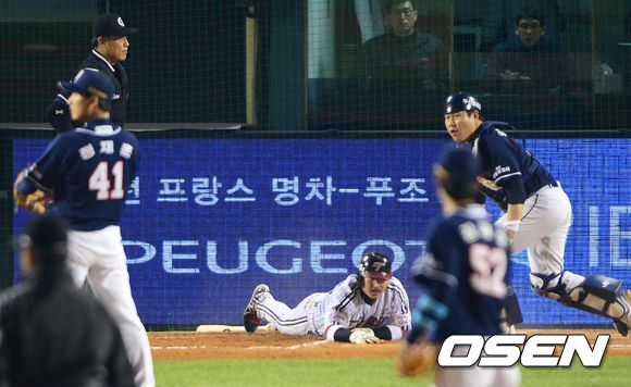 17일 오후 잠실구장에서 열린 '2013 한국야쿠르트 세븐 프로야구' LG 트윈스와 두산 베어스의 플레이오프 2차전, 6회말 1사 3루에서 LG 이진영의 내야땅볼 때 3루주자 박용택이 홈쇄도 헀지만 태그아웃 처리되고 있다.