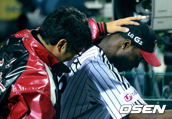 17일 오후 잠실구장에서 열린 '2013 한국야쿠르트 세븐 프로야구' LG 트윈스와 두산 베어스의 플레이오프 2차전, 8회초 수비를 마친 LG 리즈가 더그아웃을 향하며 류제국의 격려를 받고 있다.