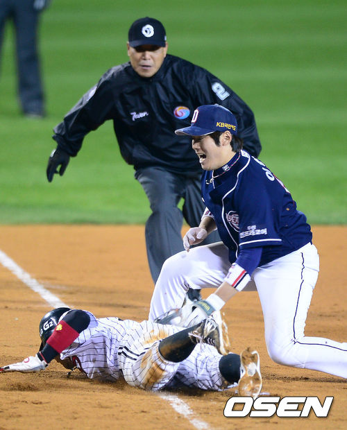 17일 오후 잠실구장에서 열린 '2013 한국야쿠르트 세븐 프로야구' LG 트윈스와 두산 베어스의 플레이오프 2차전, 8회말 1사 3루 LG 박용택 타석에 3루주자 손주인이 두산 최재훈의 견제에 태그아웃당하고 있다.