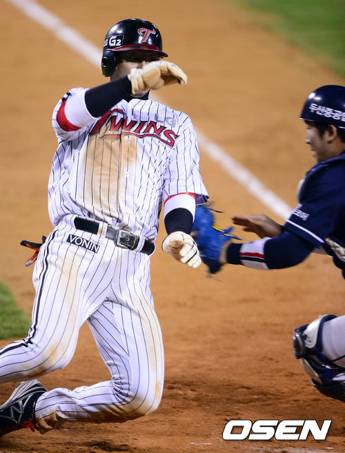 17일 오후 잠실구장에서 열린 '2013 한국야쿠르트 세븐 프로야구' LG 트윈스와 두산 베어스의 플레이오프 2차전, 8회말 2사 2루 LG 박용택이 김용의의 우전안타에 홈에서 두산 최재훈에 태그아웃당하고 있다.