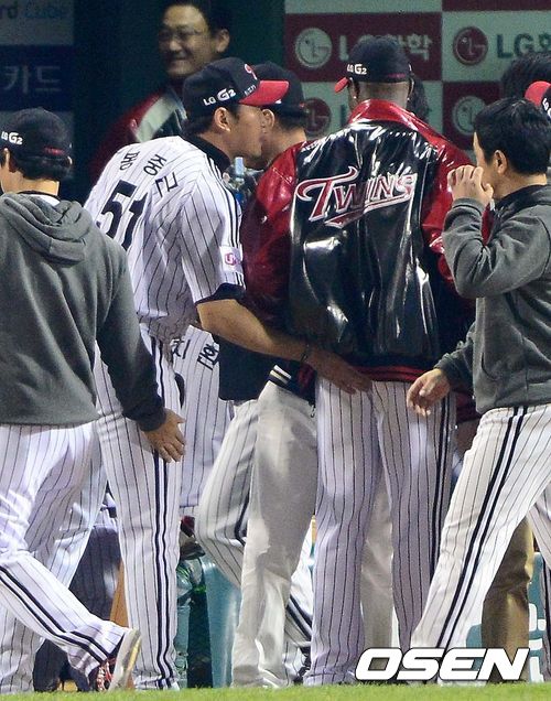 경기 종료 후 LG 봉중근이 리즈를 격려하고 있다./sunday@osen.co.kr