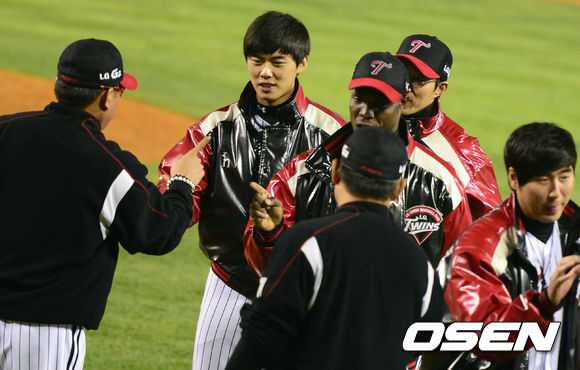 경기후 LG 리즈가 코칭스태프와 하이파이브를 하고 있다./jpnews@osen.co.kr