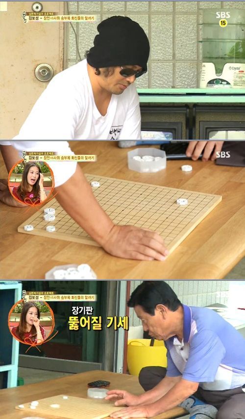 이날 김보성은 처가에서 운영 중인 슈퍼마켓에서 장인과 마주앉아 장기알로 알까기를 했다. 군인 출신인 장인은 ‘마빡(?)’ 때리기를 제안했고, 승부욕 강한 두 남자는 비장한 모습으로 알까기에 돌입해 웃음을 자아냈다.