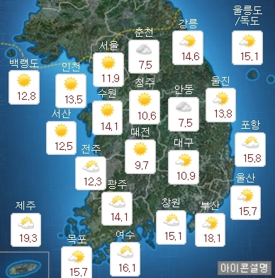 지역별로는 서울은 최저기온 8도, 최고기온 20도로 일교차가 크다. 아울러 부산 13~22도, 제주 15~20, 대전 7~20도 등의 분포를 보일 것으로 예상된다.
