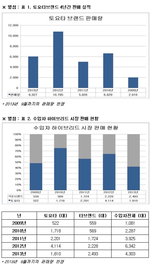짧은 기간이지만 괄목한 만한 성과도 냈다. 토요타는 2013년 9월 기준 3만 490대를 판매했다. 2003년 한국수입자동차협회(KAIDA)의 공식 판매량 집계 이후, 최단기간 3만 대 돌파 기록이다.
