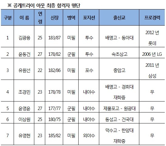 kt 야구단은 지난달 25일부터 3일간 수원 성균관대학교 야구장에서 실시된 공개 트라이아웃에서 1차 합격자 10명을 선발 후, 5일부터 1주일간 선수단 남해 가을 훈련에 합류시켜 일주일간 2차 테스트를 실시한 결과 포지션 별로 투수 2명, 포수 1명, 내야수 3명, 외야수 1명 총 7명을 최종 선발했다.