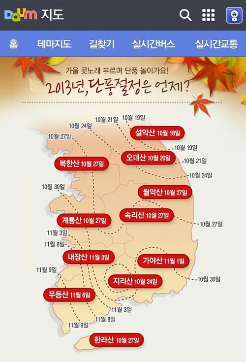 다음 단풍지도에서는 지난달 말 정상 부근에서 시작된 설악산 단풍을 시작으로 오는 11월 중순 해남 두륜산으로 이어질 전국의 단풍놀이 추천 명소 16곳의 절정시기와 등산코스 등의 정보를 확인할 수 있다.