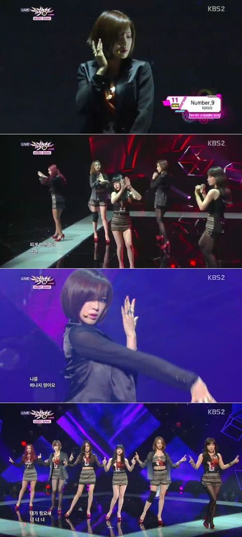 티아라는 18일 방송된 KBS 2TV '뮤직뱅크'에 출연해 타이틀 곡 '넘버나인'을 부르며, 보는 이들의 어깨를 들썩이게 만들었다. 다만 무릎부상을 입은 것으로 알려져 팬들을 안타깝게 했던 지연은 검은색 보호대를 한 채 '넘버나인' 무대를 소화해 눈길을 끌었다.