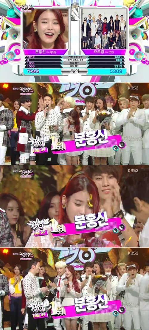아이유는 18일 오후 방송된 KBS 2TV '뮤직뱅크'에서 새 앨범 타이틀곡 '분홍신'으로 오랜만에 1위 후보에 다시 이름을 올린 엑소의 '으르렁'을 제치고 컴백후 지상파 첫 1위의 영예를 안았다. 지난주 1위곡 버스커버스커 '처음엔 사랑이란게'는 3위에 그쳤다.
