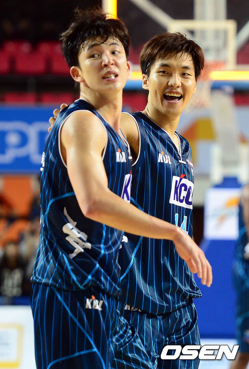 18일 오후 전주실내체육관에서 열린 '2013-2014 KB국민카드 프로농구' 전주 KCC와 안양 KGC인삼공사의 경기 3쿼터 종료 직전 슛을 성공시킨 박경상을 노승준이 격려하고 있다.