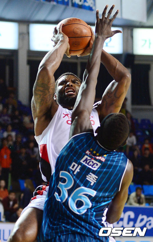 18일 오후 전주실내체육관에서 열린 '2013-2014 KB국민카드 프로농구' 전주 KCC와 안양 KGC인삼공사의 경기 4쿼터 에반스가 마족을 앞에 두고 슛을 시도하고 있다.