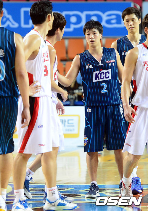 18일 오후 전주실내체육관에서 열린 '2013-2014 KB국민카드 프로농구' 전주 KCC와 안양 KGC인삼공사의 경기 종료 후 박경상이 동료들과 인사를 나누고 있다.