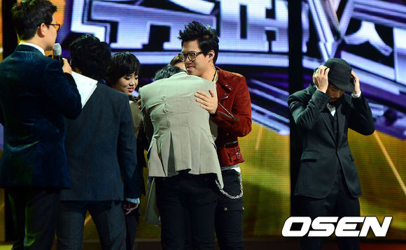 18일 오후 서울 경희대 평화의 광장에서 진행된 엠넷 '슈퍼스타K5' TOP6 생방송 공연에서 다음 생방송에 진출한 멤버들이 탈락한 임순영을 격려하고 있다.