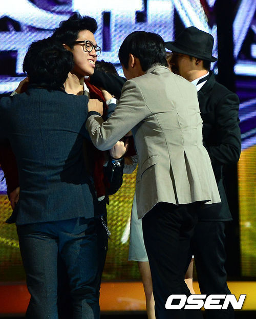 18일 오후 서울 경희대 평화의 광장에서 진행된 엠넷 '슈퍼스타K5' TOP6 생방송 공연에서 다음 생방송에 진출한 멤버들이 탈락한 임순영을 격려하고 있다.