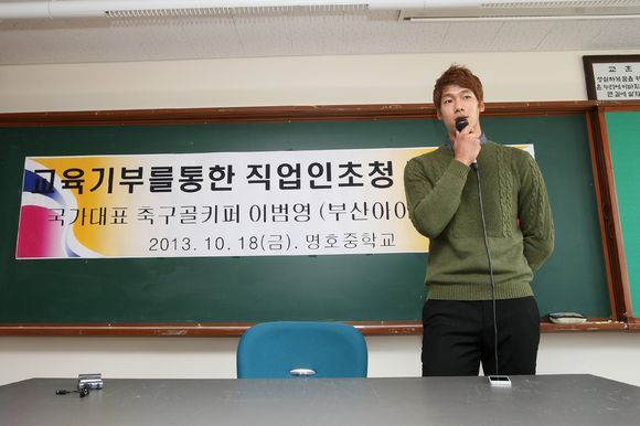 부산 아이파크의 수문장이자 대한민국 국가대표 이범영이 부산 강서구 소재 명호중을 방문해 교육 기부 교사로 학생들을 만났다. 18일 오후 2시부터 3시반까지 약 1시간 반 가량 진행된 이번 수업에는 사전 신청한 30 여명의 학생들이 참여해 축구 선수가 전하는 특별한 직업 이야기를 들을 수 있었다.