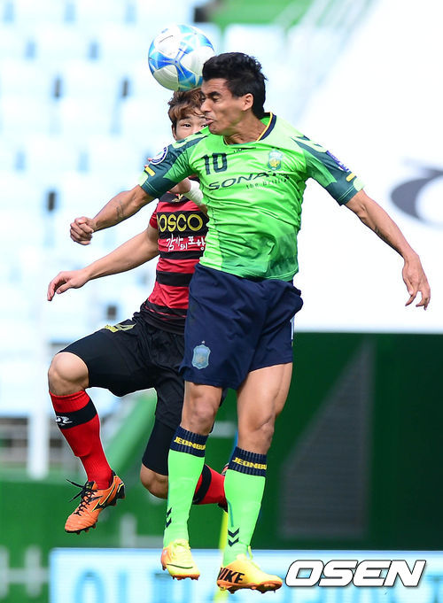 19일 오후 전주월드컵경기장에서 열린 '2013 하나은행 FA컵' 전북 현대와 포항 스틸러스의 경기 전반 레오나르도가 공중볼 다툼을 하고 있다.