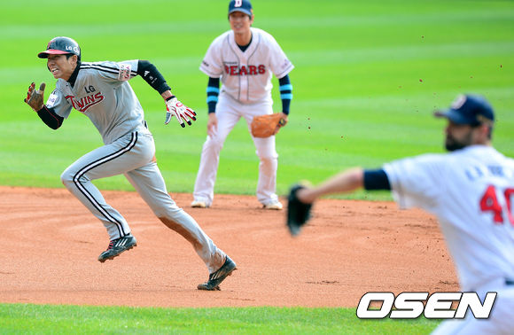19일 오후 서울 잠실야구장에서 열린 '2013 한국야쿠르트 세븐 프로야구' 플레이오프 3차전 두산 베어스 대 LG 트윈스의 경기, 1회초 1사 2,3루에서 LG 김용의가 3루 도루를 시도하고 있다.