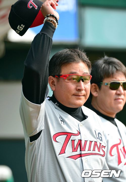 19일 오후 서울 잠실야구장에서 열린 '2013 한국야쿠르트 세븐 프로야구' 플레이오프 3차전 두산 베어스 대 LG 트윈스의 경기, 식전행사에서 김기태 감독이 인사를 하고 있다.