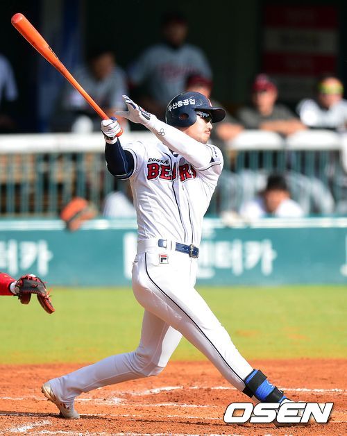 19일 오후 서울 잠실야구장에서 열린 '2013 한국야쿠르트 세븐 프로야구' 플레이오프 3차전 두산 베어스 대 LG 트윈스의 경기, 2회말 두산 공격 2사 1루 상황 오재원이 우전안타를 날리고 있다.