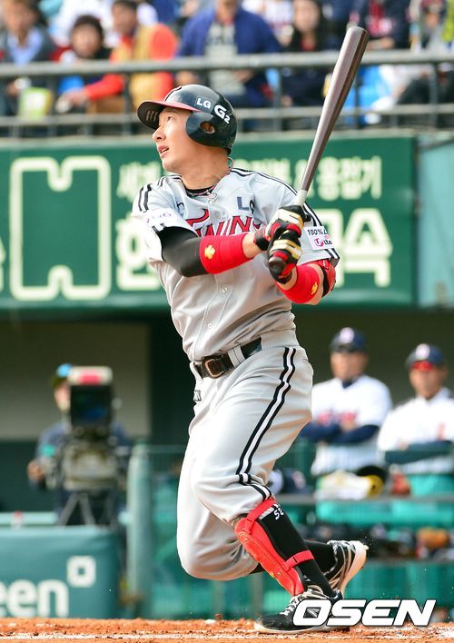 19일 오후 서울 잠실야구장에서 열린 '2013 한국야쿠르트 세븐 프로야구' 플레이오프 3차전 두산 베어스 대 LG 트윈스의 경기, 2회초 2사 손주인이 LG 첫 안타를 치고 있다.