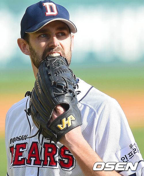 19일 오후 서울 잠실야구장에서 열린 '2013 한국야쿠르트 세븐 프로야구' 플레이오프 3차전 두산 베어스 대 LG 트윈스의 경기, 3회초 LG 공격 2사 1루 상황 이병규를 내야땅볼로 이끌며 무실점으로 이닝을 마친 두산 선발 니퍼트가 더그아웃으로 들어오며 글러브를 깨물고 있다.
