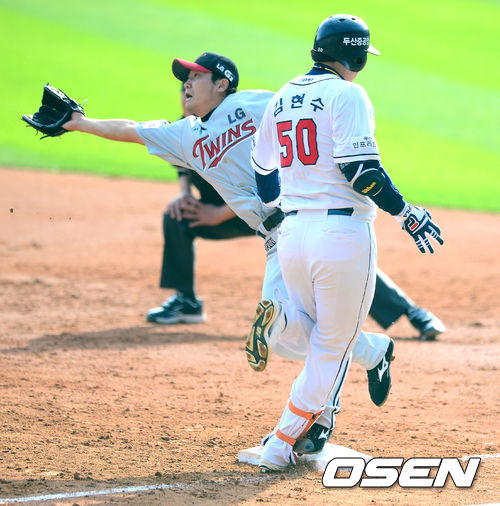 19일 오후 서울 잠실야구장에서 열린 '2013 한국야쿠르트 세븐 프로야구' 플레이오프 3차전 두산 베어스 대 LG 트윈스의 경기, 3회말 무사 만루에서 두산 김현수가 유격수 땅볼을 날리고 1루에서 베이스 커버 들어온 LG 신재웅과 충돌하고 있다.