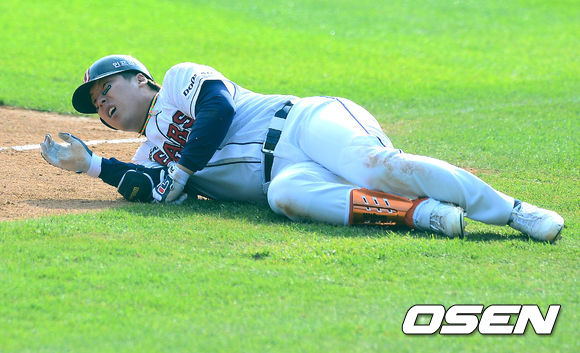 19일 오후 서울 잠실야구장에서 열린 '2013 한국야쿠르트 세븐 프로야구' 플레이오프 3차전 두산 베어스 대 LG 트윈스의 경기, 3회말 무사 만루에서 두산 김현수가 유격수 땅볼을 날리고 1루에서 베이스 커버 들어온 LG 신재웅과 충돌하고 괴로워하고 있다.