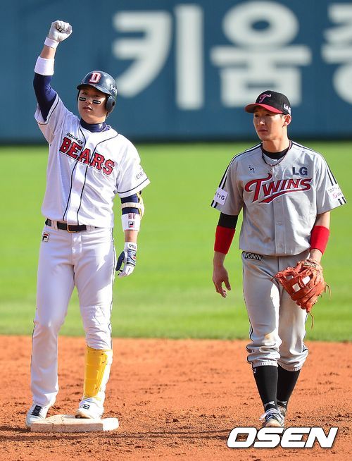 19일 오후 서울 잠실야구장에서 열린 '2013 한국야쿠르트 세븐 프로야구' 플레이오프 3차전 두산 베어스 대 LG 트윈스의 경기, 3회말 2사 1, 3루 상황 이원석이 1타점 좌익선상 2루타를 날리고 환호하고 있다.