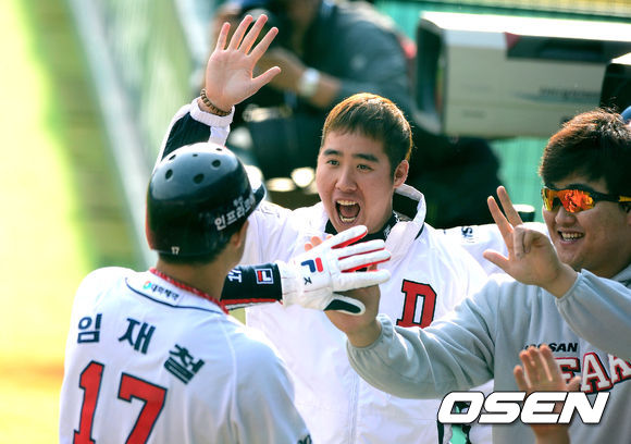 19일 오후 서울 잠실야구장에서 열린 '2013 한국야쿠르트 세븐 프로야구' 플레이오프 3차전 두산 베어스 대 LG 트윈스의 경기, 4회말 1사 1루에서 두산 임재철이 정수빈의 1타점 적시 3루타에 홈을 밟고 더그아웃에서 동료선수들과 기뻐하고 있다.
