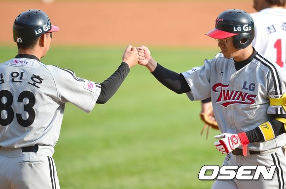 19일 오후 서울 잠실야구장에서 열린 '2013 한국야쿠르트 세븐 프로야구' 플레이오프 3차전 두산 베어스 대 LG 트윈스의 경기, 5회초 LG 공격 1사 1, 3루 상황 4번 정성훈이 1타점 좌전안타를 날리고 김인호 코치와 인사를 나누고 있다.