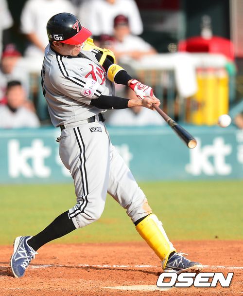 19일 오후 서울 잠실야구장에서 열린 '2013 한국야쿠르트 세븐 프로야구' 플레이오프 3차전 두산 베어스 대 LG 트윈스의 경기, 5회초 LG 공격 1사 1, 3루 상황 4번 정성훈이 1타점 좌전안타를 날리고 있다.