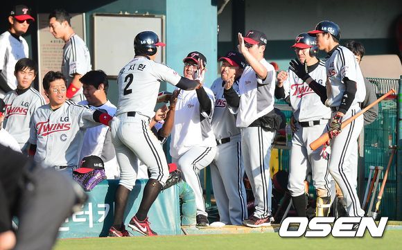 19일 오후 서울 잠실야구장에서 열린 '2013 한국야쿠르트 세븐 프로야구' 플레이오프 3차전 두산 베어스 대 LG 트윈스의 경기, 6회초 LG 공격 1사 3루 상황 대타 현재윤 타석 때 두산 선발 니퍼트의 공이 폭투로 이어져 3루 주자 오지환이 홈을 밟았다. 오지환과 인사를 나누는 LG 더그아웃 선수들.