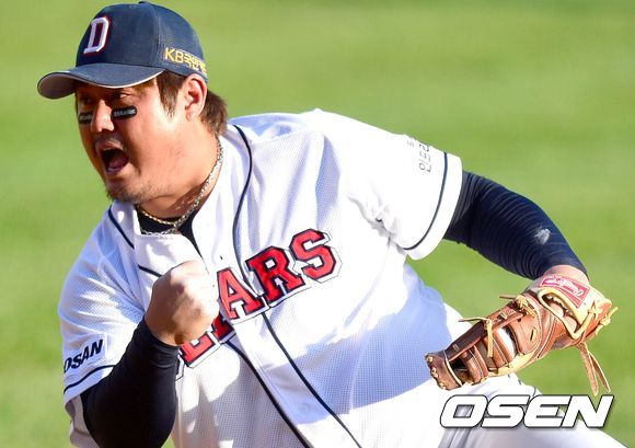 19일 오후 서울 잠실야구장에서 열린 '2013 한국야쿠르트 세븐 프로야구' 플레이오프 3차전 두산 베어스 대 LG 트윈스의 경기, 6회초 LG 공격 1사 1, 3루 상황 2번타자 김용의의 1루수 직선타를 잡아낸 두산 1루수 최준석이 1루주자까지 포스아웃 시키며 더블아웃을 만들어 낸 뒤 환호하고 있다.