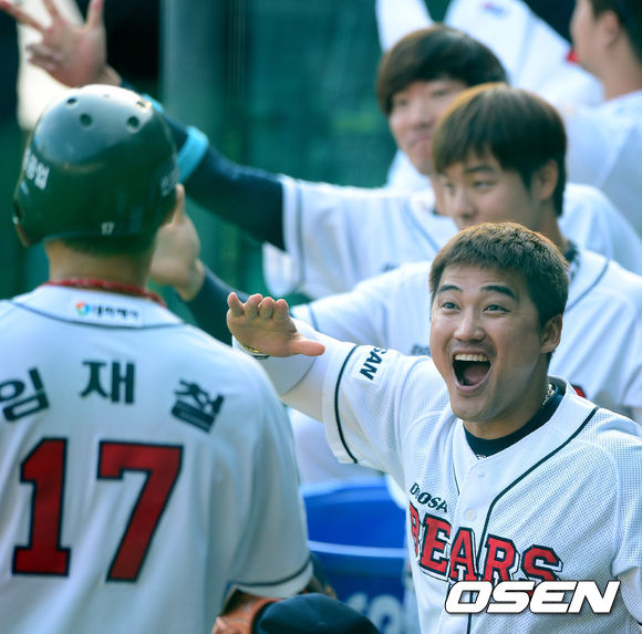 19일 오후 서울 잠실야구장에서 열린 '2013 한국야쿠르트 세븐 프로야구' 플레이오프 3차전 두산 베어스 대 LG 트윈스의 경기, 6회말 2사 1,2루에서 두산 최주환의 1타점 적시타에 홈을 밟은 임재철이 더그아웃에서 홍성흔과 하이파이브를 하고 있다.