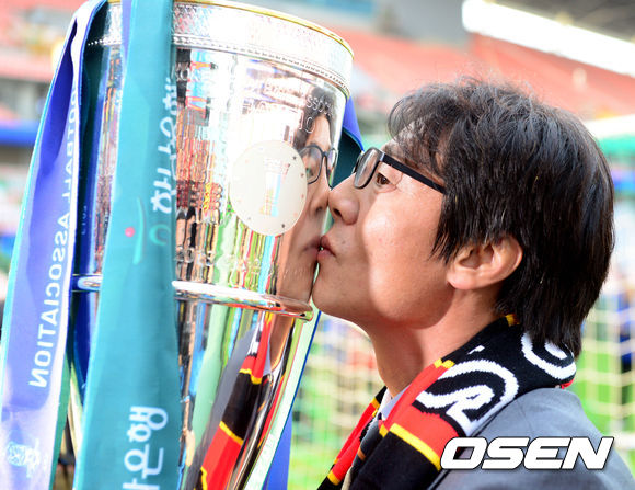 19일 오후 전주월드컵경기장에서 열린 '2013 하나은행 FA컵' 전북 현대와 포항 스틸러스의 경기 종료 후 황선홍 감독이 우승컵에 키스를 하고 있다.