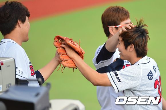 19일 오후 서울 잠실야구장에서 열린 '2013 한국야쿠르트 세븐 프로야구' 플레이오프 3차전 두산 베어스 대 LG 트윈스의 경기, 7회초 LG 공격 1사 1루 상황 이병규의 잘맞은 좌중간 타구를 두산 중견수 정수빈이 넘어지며 멋지게 잡아냈다. 실점없이 이닝을 마친 뒤 더그아웃으로 들어오며 동료들의 환호를 받는 정수빈.