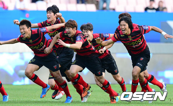 19일 오후 전주월드컵경기장에서 열린 '2013 하나은행 FA컵' 전북 현대와 포항 스틸러스의 경기 승부차기에서 우승이 확정된 포항 선수들이 환호하고 있다.