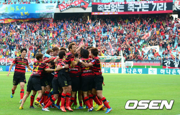 19일 오후 전주월드컵경기장에서 열린 '2013 하나은행 FA컵' 전북 현대와 포항 스틸러스의 경기 종료후 포항 선수들이 우승을 기뻐하고 있다.