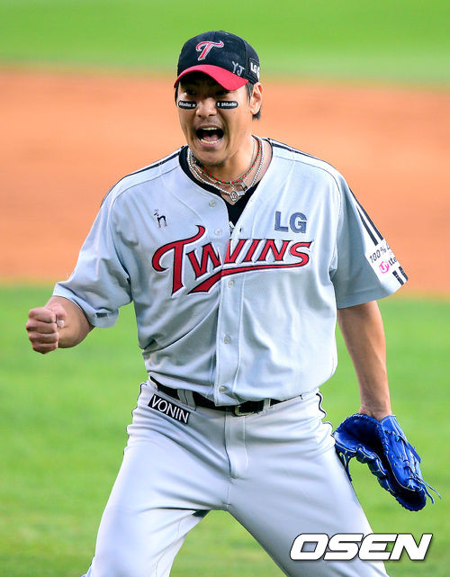 19일 오후 서울 잠실야구장에서 열린 '2013 한국야쿠르트 세븐 프로야구' 플레이오프 3차전 두산 베어스 대 LG 트윈스의 경기, 7회말 2사 2,3루에서 LG 이동현이 두산 임재철을 3루 땅볼로 처리하고 기뻐하고 있다.