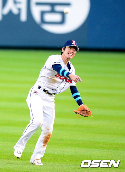 19일 오후 서울 잠실야구장에서 열린 '2013 한국야쿠르트 세븐 프로야구' 플레이오프 3차전 두산 베어스 대 LG 트윈스의 경기, 8회초 1사에서 LG 손주인의 타구를 두산 김재호가 호수비로 잡아내고 1루로 송구하고 있다.