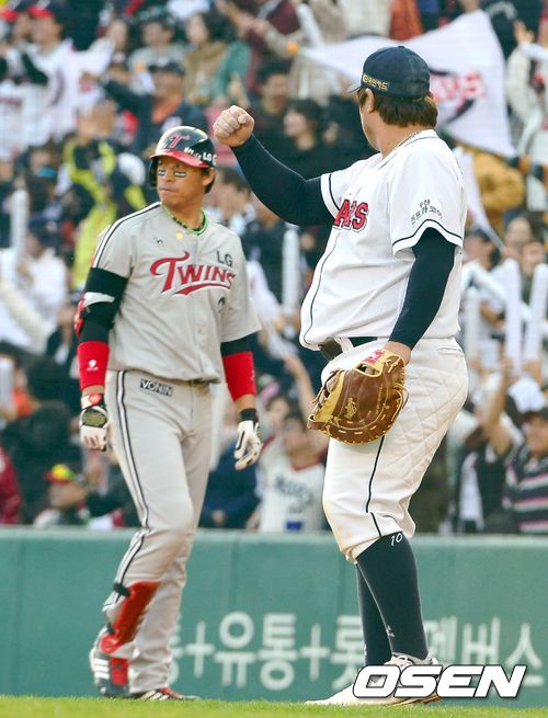 19일 오후 서울 잠실야구장에서 열린 '2013 한국야쿠르트 세븐 프로야구' 플레이오프 3차전 두산 베어스 대 LG 트윈스의 경기, 7회초 1사 1루 이병규의 안타성 타구를 정수빈이 다이빙캐치 아웃시키자 최준석이 주먹을 불끈쥐고 있다.