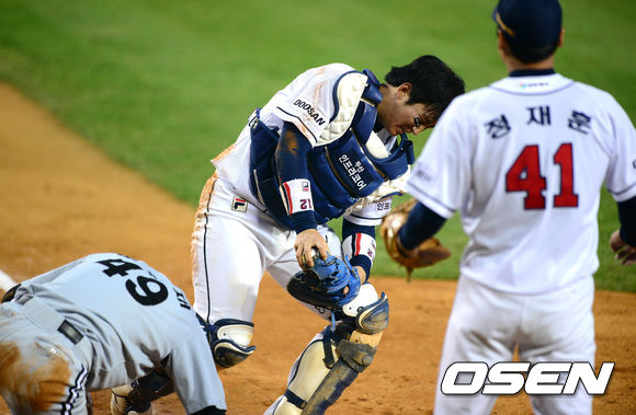 9회초 2사 2루에서 LG 이병규의 우전안타에 문선재가 두산 최재훈의 블로킹에 막혀 태그아웃당하며 경기가 종료되고 있다../jpnews@osen.co.kr