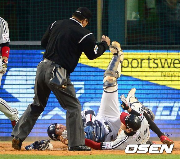 9회초 1사 2루에서 LG 정성훈의 좌전안타 때 홈으로 쇄도한 2루주자 이대형이 홈에서 아웃되고 있다./sunday@osen.co.kr