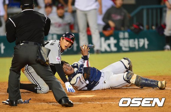 9회초 2사 2루 상황 이병규의 우전안타 때 홈으로 내달린 대주자 문선재가 두산 포수 최재훈의 태그에 걸려 아웃되며 경기가 종료됐다. 심판에게 아웃판정을 확인하는 최재훈./dreamer@osen.co.kr