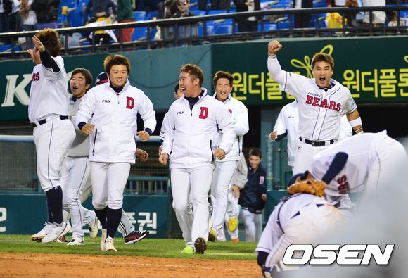 9회초 2사 2루에서 LG 이병규의 우전안타에 문선재가 두산 최재훈의 블로킹에 막혀 태그아웃당하며 경기가 종료되자 두산 선수들이 기뻐하고 있다./spjj@osen.co.kr