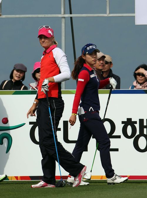 6번홀에서 교차하듯 스치는 박주영(오른쪽)과 안나 노르드크비스트.