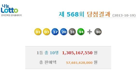10월 19일 밤 추첨 된 568회차 나눔로또 당첨번호는 1, 3, 17, 20, 31, 44번이고 보너스 번호는 40번이다. 1등 당첨자는 모두 10명이며 당첨금액은 13억 원씩이다.